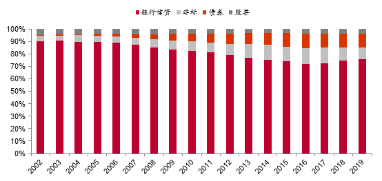 中国社会融资结构(剔除政府融资后的社融存量占比%)
