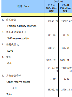 国家外汇管理局统计数据显示,截至2026年1月末,我国外汇储备规模为33991亿美元,较2025年12月末上升412亿美元,升幅为1.23%。央行数据显示,中国1月末黄金储备报7419万盎司,12月末为7415万盎司,为连续第15个月增持黄金。