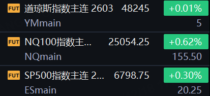 12月18日,美股三大股指期货小幅上涨,截止发稿,道指期货涨0.01%,纳指期货涨0.62%,标普500指数期货涨0.3%。