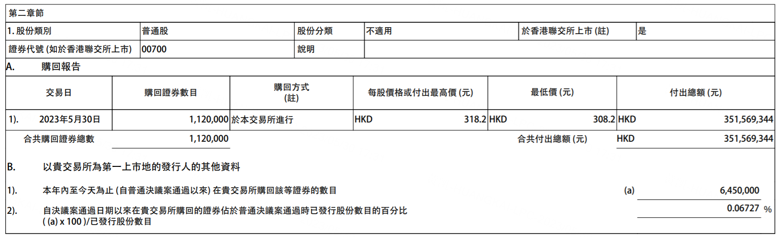 5月30日,腾讯控股发布公告,当日斥资约3.52亿港元回购股份112万股,每股成交价格介于308.2港元至318.2港元。