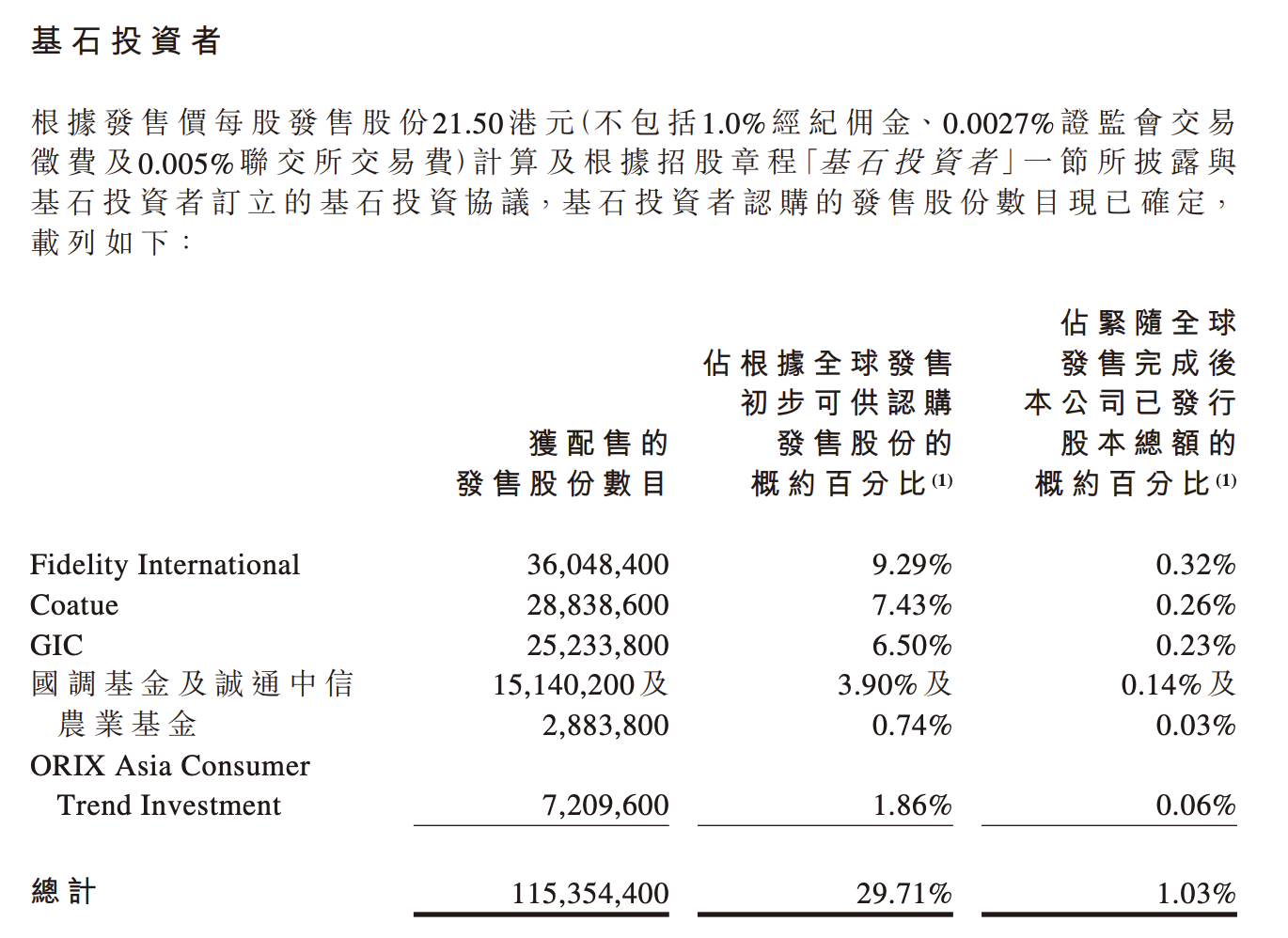 中签结果显示,农夫山泉一手中签率12%,认购150手稳中一手。基石方面,富达国际、Coatue、GIC、国调基金及诚通中信农业基金和ORIX 亚洲消费趋势基金最终获配如下: