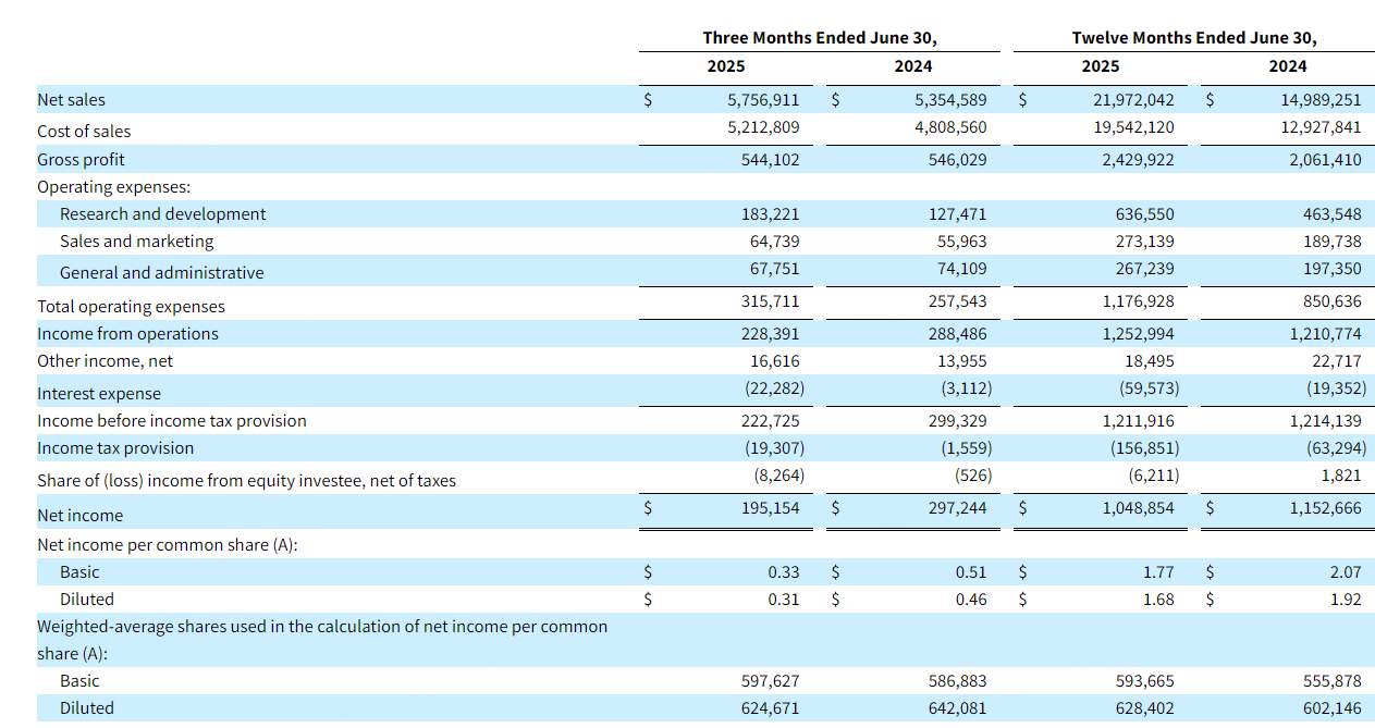 8月6日,超微电脑公布2025财年第四季度营收为57.6亿美元,低于市场预期的60.1亿美元。毛利率为9.5%,分析师预期10%,略低于上一季度的9.6%,也低于去年同期的10.2%。