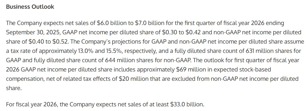 公司预计,截至2025年9月30日的2026财年第一季度净销售额为60亿至70亿美元,预计2026财年净销售至少330亿美元。