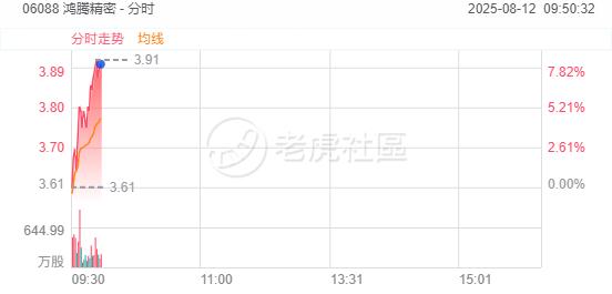 8月12日,港股苹果概念股延续升势,鸿腾精密涨超8%,比亚迪电子涨超4%,丘钛科技、高伟电子涨超2%。
