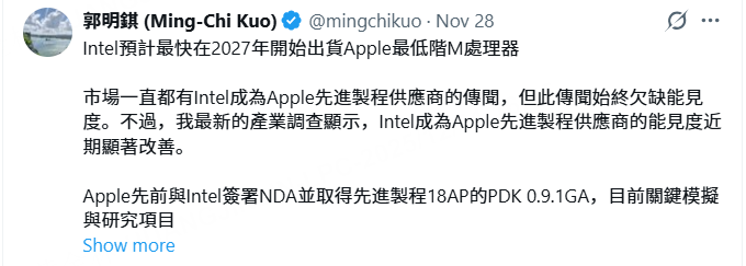Intel 有望最早于 2027 年开始为 Apple 供应最低端的 M 系列处理器。过去市场一直流传 Intel 可能成为 Apple 的先进制程代工供应商,但其可行性一直不明朗;