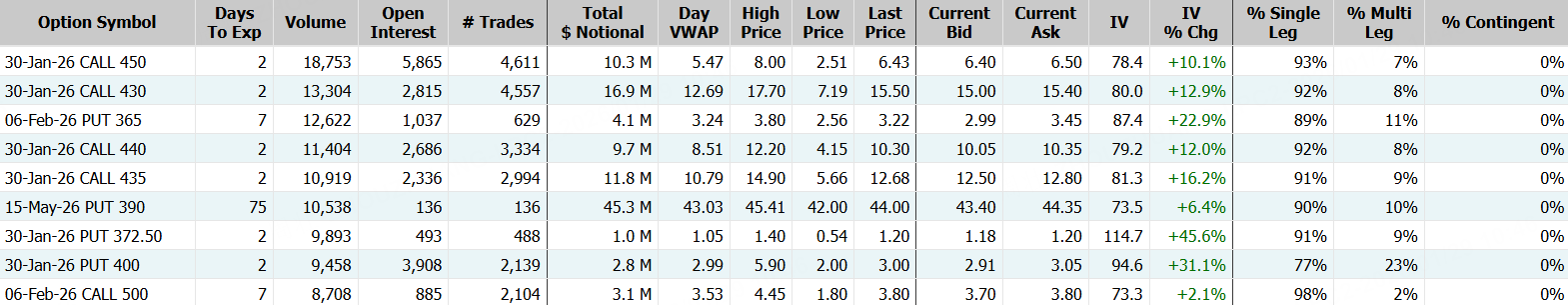 期权方面,美光科技当日成交56.88万张,较90日均量放大近2倍,看涨期权占比54.3%,其中于1月30日到期的450美元行使价的看涨期权成交居前,成交逾1.8万张。
