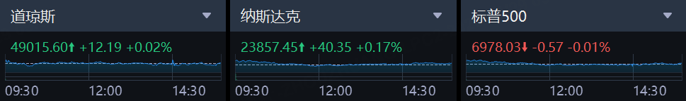 周三,美股三大指数涨跌不一,截至收盘,道琼斯指数涨0.02%,报49015.60点;纳斯达克综合指数涨0.17%,报23857.45点;标普500指数跌0.01%,报6978.03点,早盘一度升破7000点大关,最高报7002.28点,创下盘中纪录。