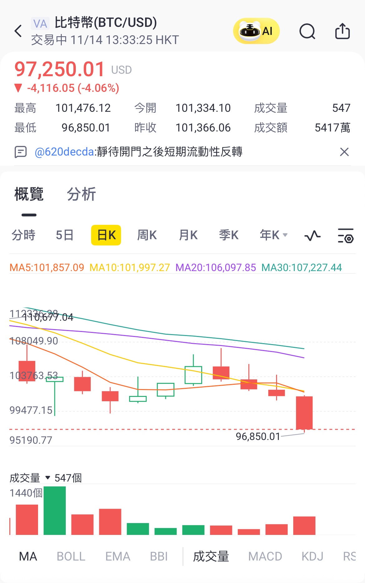 根据Tiger Trade数据,最大加密货币的比特币(BTCUSD)下跌 4.06% 至 97250美元,触及自 5 月 8 日以来的最低水平。与 10 月 6 日创下的 126,273 美元的历史高点相比,目前价格已下跌超22%。