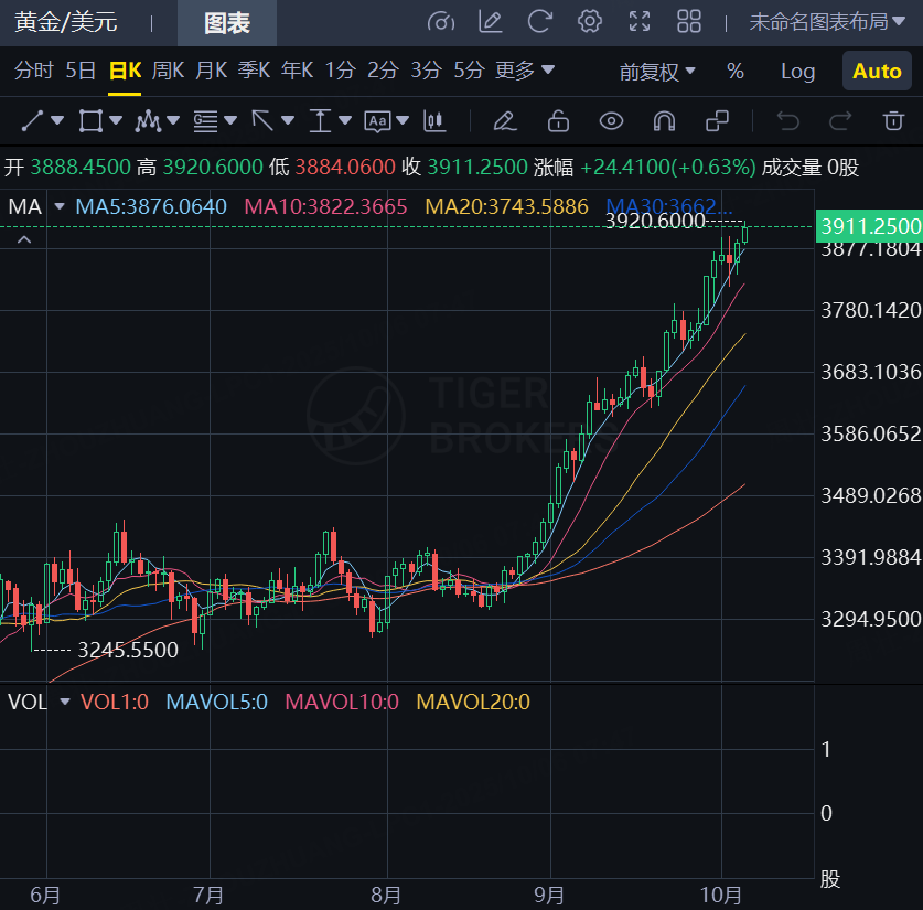10月6日,由于美国政府持续关门带来的不确定性加剧以及降息预期升温,现货黄金开局维持强势,一度向上触及3920美元/盎司,再创历史新高。此时距离首次突破3800美元关口仅不到10天。