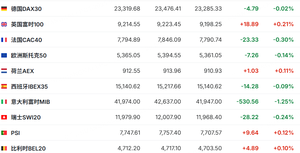 欧洲主要股指涨跌不一,德国DAX30跌0.02%,法国CAC40跌0.30%。