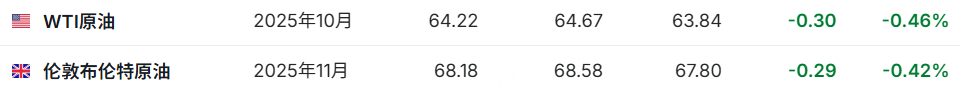 原油期货下跌,截止发稿,WTI原油跌0.46%,报64.22美元/桶;布伦特原油跌0.42%,报68.18美元/桶。