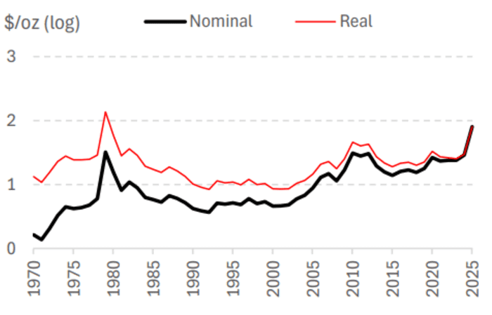 法国兴业银行由全球大宗商品研究主管 Mike Haigh 博士领导的研究团队指出,如果不使用传统的线性图表,而是改用对数刻度的时间序列图来观察银价走势,那么2025年的这轮上涨看起来就远没有那么夸张。对法兴而言,这反映的是“在过去25年里,白银一直在运行的同一种复利式增长逻辑”。