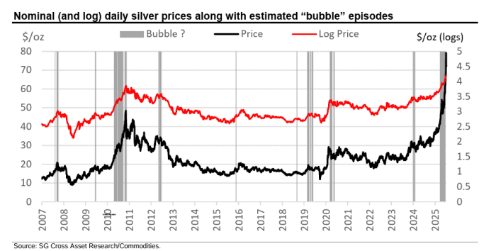 法国兴业银行(Societe Generale)采用对数周期幂律奇点(LPPLS)框架的模型显示,白银在2025年的表现与历史上的泡沫阶段相似。