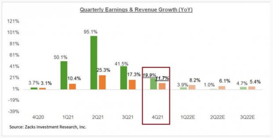放眼大盘,Zacks预计标普500指数成分股第四季度的收益将比去年同期增长19.9%,收入增长11.7%,这相对于过去几个季度的大幅增长有所放缓,并且这一趋势将在2022年延续。