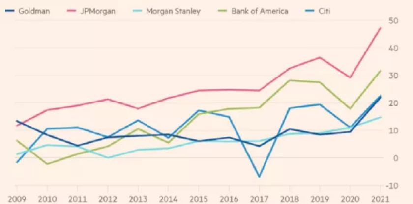 根据标普和彭博的估算数据,高盛、摩根大通、摩根士丹利、花旗和美国银行5家大型银行将创2009年来最佳业绩,花旗有望公布有史以来最高的全年利润。德意志银行银行研究主管马特•奥康纳表示:可能要再过10来年,才能看到大型银行高于2021年的水平。