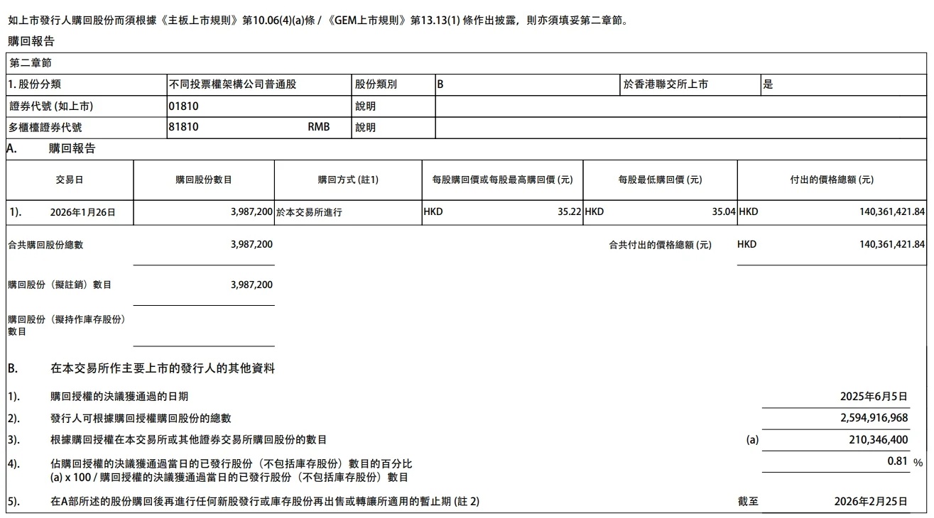 小米集团-W :1月26日斥资约1.4亿港元回购398.72万股B类股份,每股回购价格为35.04港元-35.22港元。