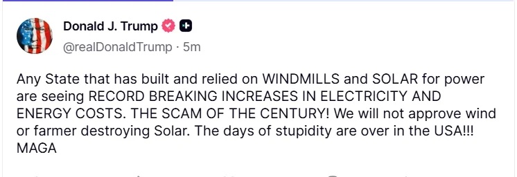 8月20日,美国总统特朗普表示,任何建造并依赖风车和太阳能发电的州,都将看到电力和能源成本破纪录的增长。