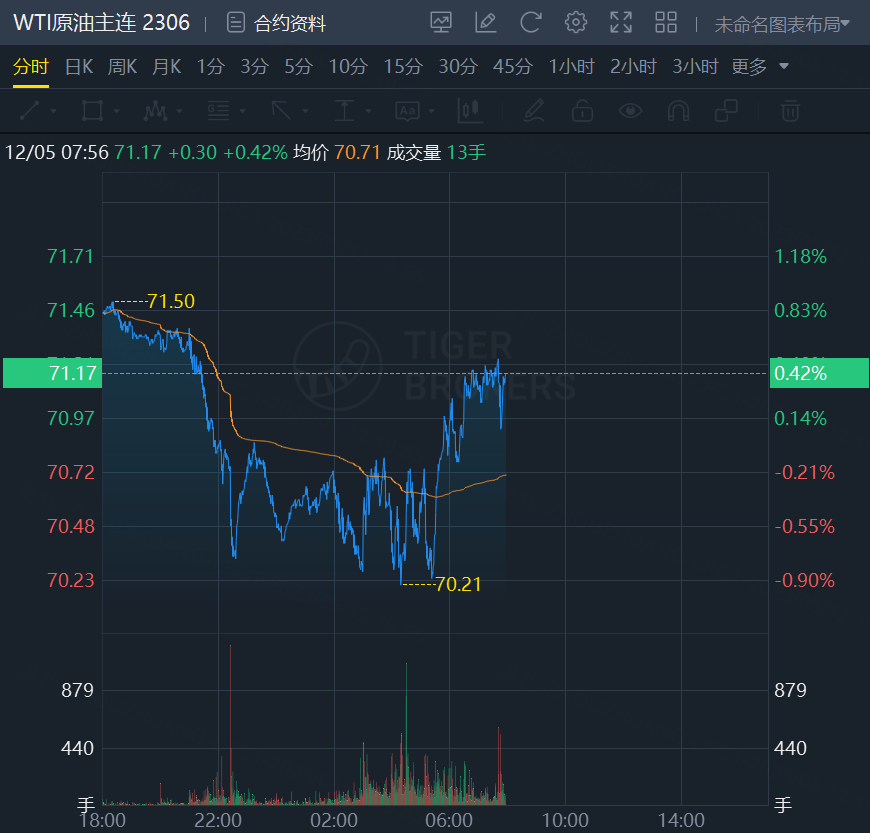 原油期货震荡走高,截止发稿,WTI原油涨0.42%,报71.17美元/桶;布伦特原油涨0.25%,报75.17美元/桶。