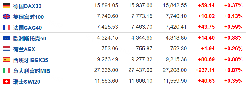 欧洲主要股指全线上涨,截至发稿,德国DAX30指数涨0.37%,英国富时100涨0.13%,法国CAC40涨0.59%。