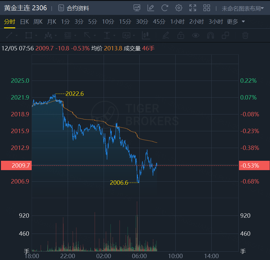 黄金期货走低,截止发稿,跌0.53%,报2009.7美元/盎司。