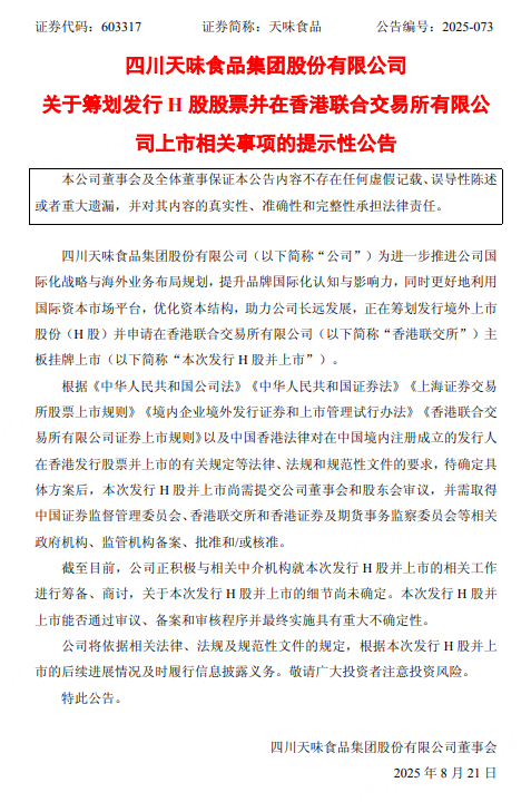 8月20日,天味食品公告称,公司正在筹划发行境外上市股份(H股)并申请在香港联合交易所有限公司主板挂牌上市。该事项尚需提交公司董事会和股东会审议,并需取得相关政府机构、监管机构备案、批准和/或核准。目前,公司正积极与相关中介机构进行筹备和商讨,但细节尚未确定,能否通过审议、备案和审核程序并最终实施具有重大不确定性。