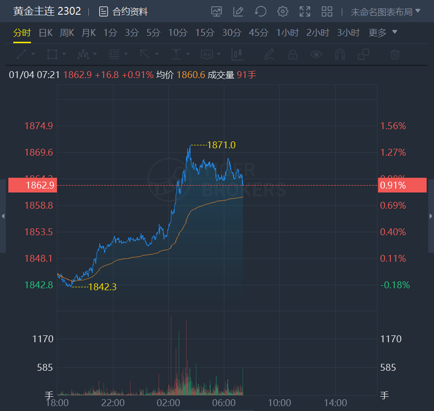 黄金期货走高,截止发稿,涨0.91%,报1862.9美元/盎司。