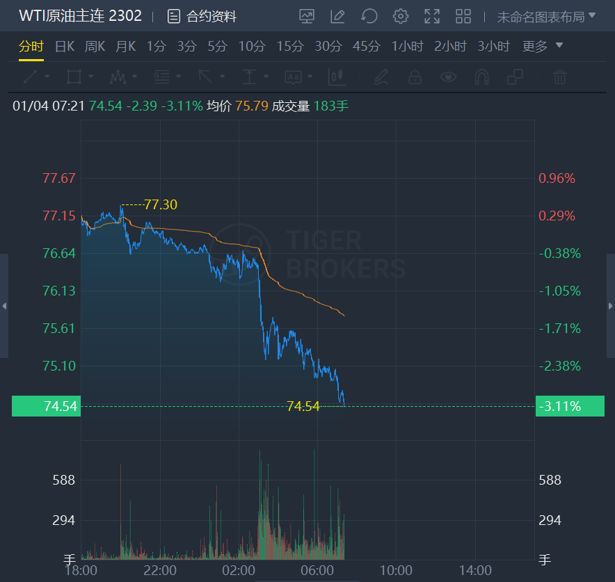 原油期货持续下跌,截止发稿,WTI原油跌3.11%,报74.54美元/桶;布伦特原油跌3.22%,报79.46美元/桶。