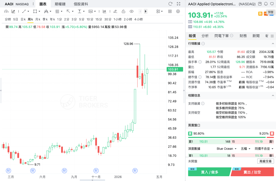 一年前,应用光电 Applied Optoelectronics Inc. 还是一只无人关注、持续亏损的科技股,最为人所知的是它在2017年因亚马逊砍掉订单而导致股价崩盘。如今,它已然成为美股市场最火热的中型市值标的之一。