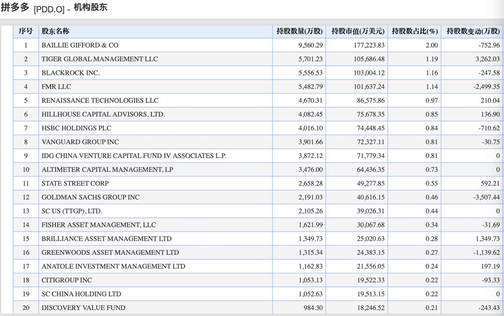 根据笔者的梳理,当前最受国际投资者关注的公司的其前十大机构持有人几乎都为顶级国际资管机构。例如,拼多多的第一大机构持有人(持有2%)是英国爱丁堡的“百年老店”柏基投资(Baillie Gifford),该机构也是特斯拉背后的“大金主”,早在7年前就开始投资,其后是老虎全球管理(1.19%)、贝莱德(1.16%)、FRM(1.14%)、文艺复兴(0.97%)、高瓴资本(0.85%)等一线资管巨头或对冲基金;京东前几大机构持有人包括老虎全球管理、贝莱德、Vanguard、景顺(Invesco)等,这些都是来自美国的顶级资管机构。