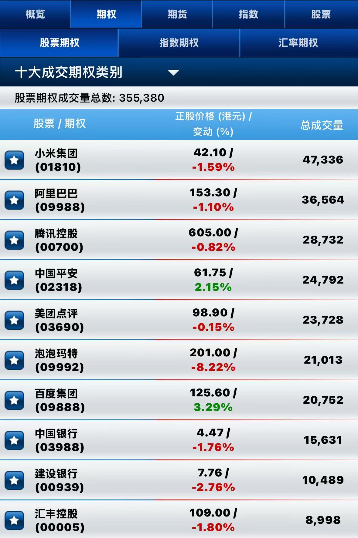 截止午间收盘,港股期权半日成交超35.5万张。其中,小米集团-W成交量居前,期权成交超4.7万张;阿里巴巴-W名列次席,期权成交超3.6万张;腾讯控股位居第三,期权成交近2.9万张。