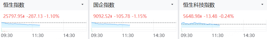 12月8日,港股三大指数齐跌,截止午间收盘,恒生指数跌1.10%,恒生科技指数跌0.24%,国企指数跌1.15%。
