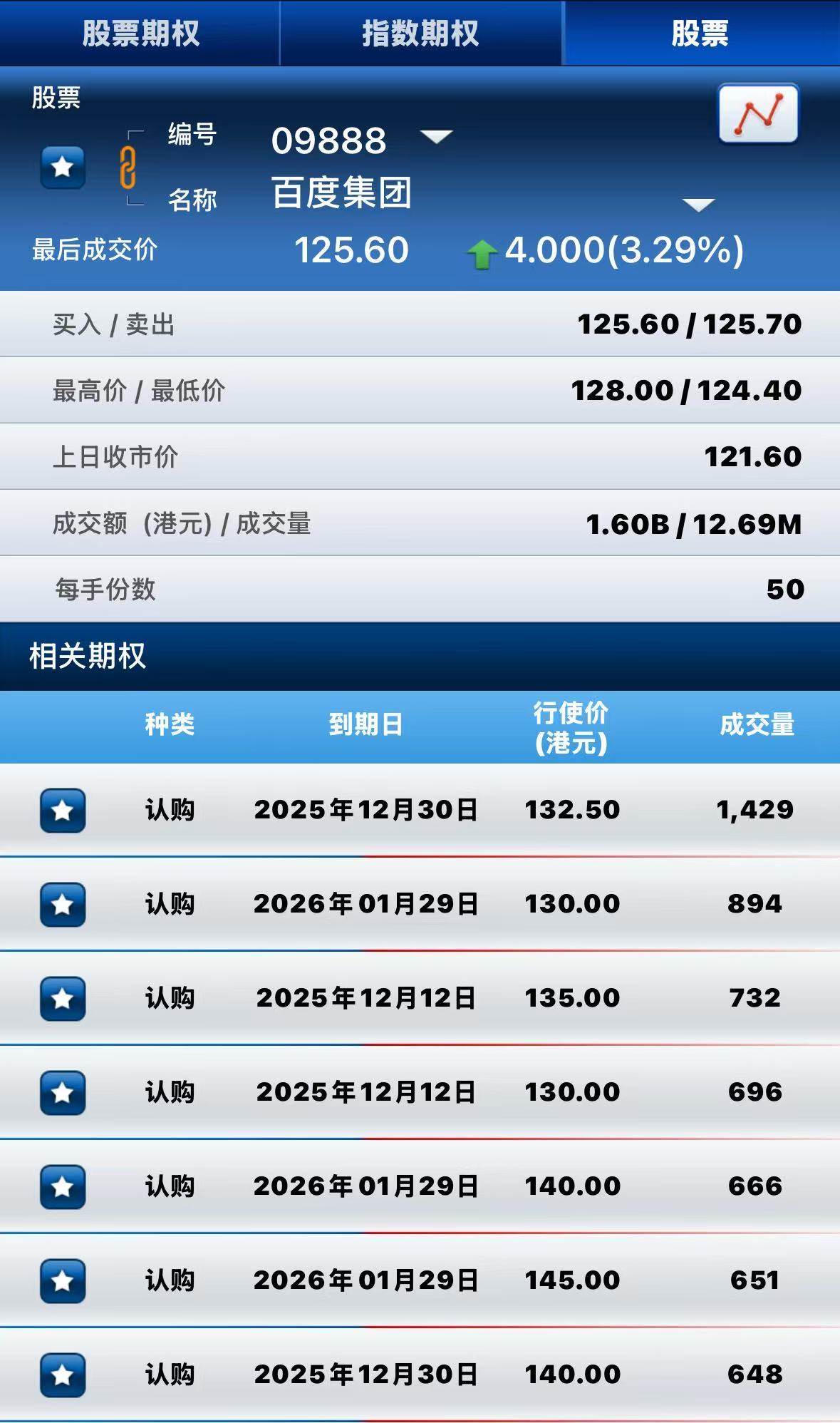 百度集团-SW涨超3%,期权方面:半日成交超2万张合约,其中于12月30日到期行权价132.5港元的认购期权成交量居前,成交超1400张合约。 $BIU.HK 20251212 132.50 CALL$