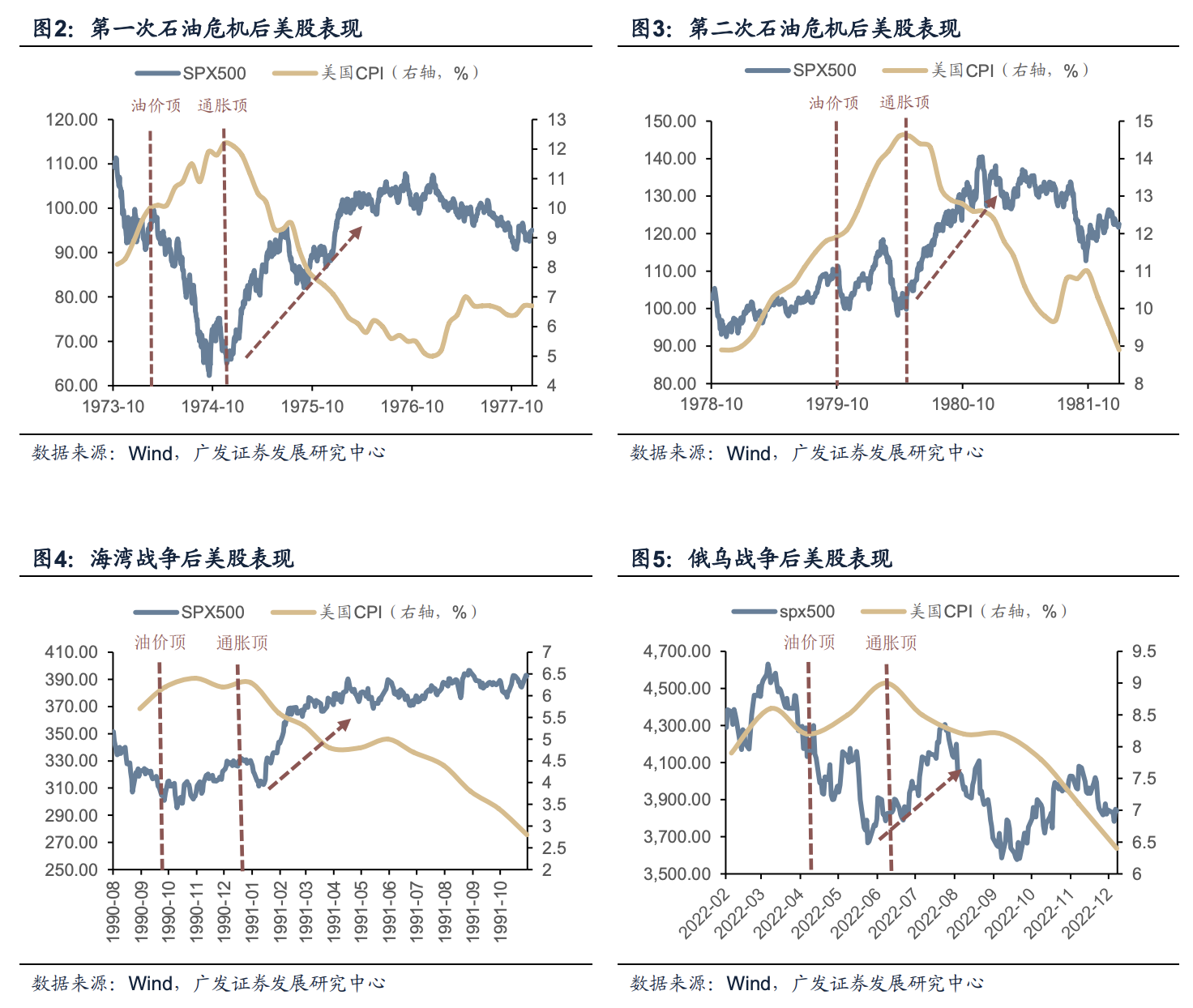 决定反弹时机的核心信号并非油价顶,而是通胀顶。油价对权益市场的冲击绑定"高油价→高通胀→企业利润受侵蚀、流动性收紧"这一传导链条,五轮战争周期均验证: