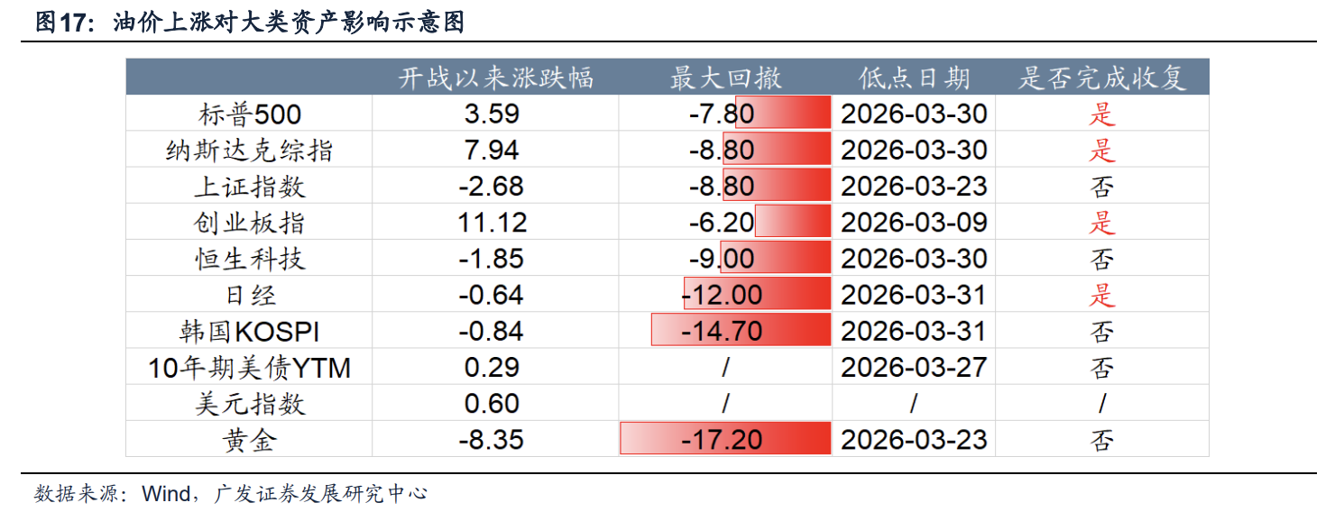 从当前大类资产修复进度来看,标普500、纳斯达克综指、创业板指、日经指数已全额收复开战以来跌幅,而上证指数、恒生科技、韩国KOSPI、10年期美债及黄金资产尚未完成修复,格局显著分化。