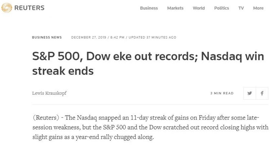 路透社:标普和道指再创新高纳指终结连涨