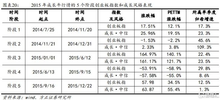 具体来看,2014-2015年市场大牛市行情,可以划分为5个阶段,其中成长牛主要体现在第三阶段的牛市加速行情和第五阶段的估值修复反弹行情。