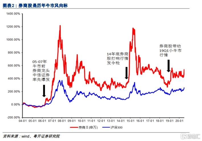 粤开证券李兴研报强调,券商股是历年牛市风向标,从券商股在A股最近几次牛市和反弹市表现来看,券商启动一般先于市场整体行情。