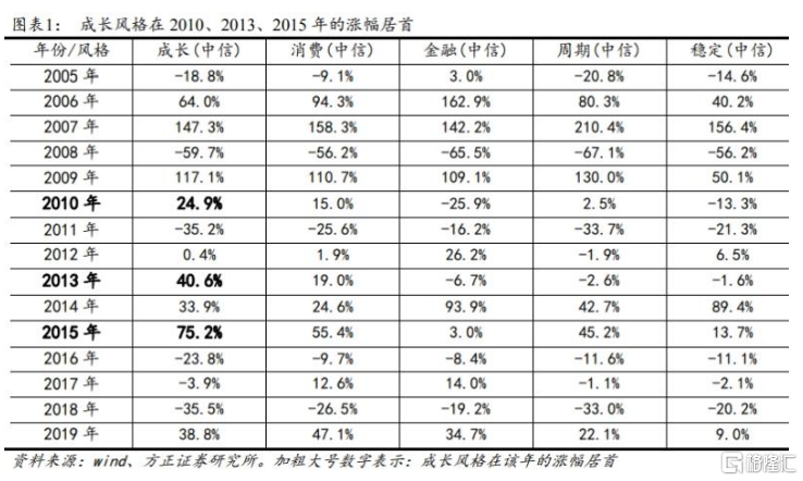 回看2015年A股牛市行情,据方正证券胡国鹏团队研报梳理,2015年成长牛是发生在一次大牛市环境下的成长风格占优行情,从2014年7月行情启动到2015年12月估值修复反弹行情结束,期间成长风格上涨134%,相较其余风格均在100%左右的涨幅有较显著占优。