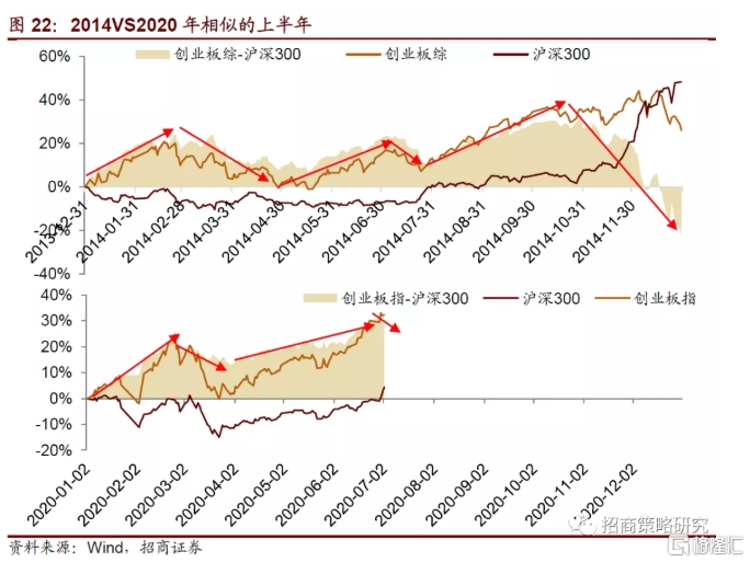 报告认为,相似的宏观背景下2014和2020上半年A股风格相似。但差异之处又决定了2020下半年与2014下半年不尽相同,将会呈现轮涨、混合的风格。