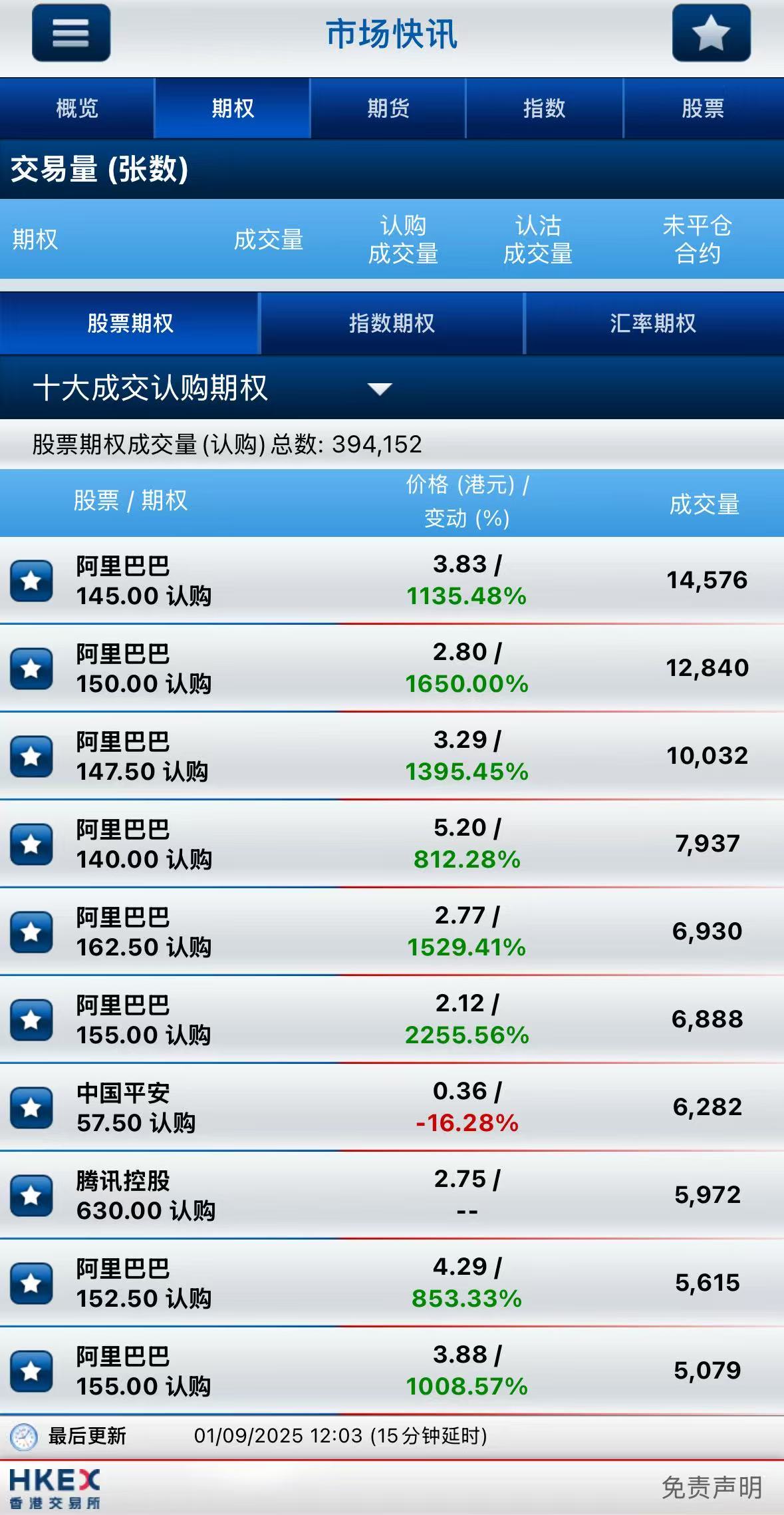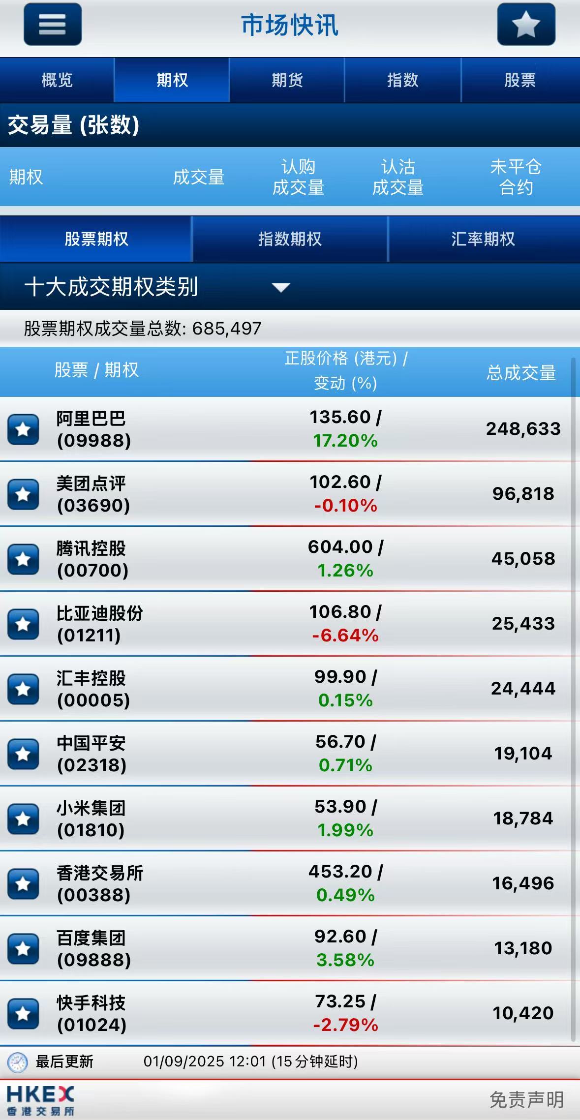 截止午间收盘,港股期权半日成交超68万张,较前一交易日大幅增长;其中,阿里巴巴-W成交量居首,期权成交近25万张;美团-W名列次席,期权成交超9.6万张;腾讯控股位居第三,期权成交超4.5万张。