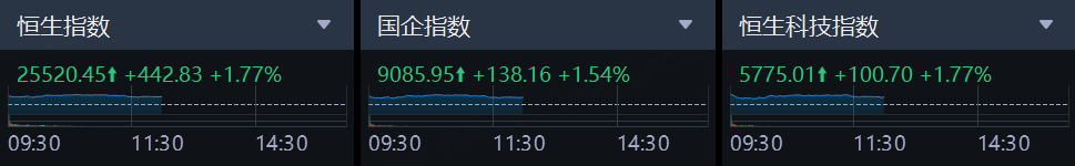 9月1日,港股上午盘三大指数集体强势,盘中均涨超2%以上。市场得益于阿里巴巴大涨带动市场情绪,科技股领衔大市上涨。截止午盘,恒生指数涨1.77%上扬近450点,国企指数、恒生科技指数分别上涨1.54%及1.77%。