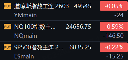2月17日,美股三大股指期货集体走低,截止发稿,道指期货跌0.05%,纳指期货跌0.59%,标普500指数期货跌0.22%。