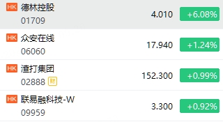 稳定币概念多数上涨,德林控股涨超6%,众安在线涨超1%,渣打集团、联易融涨近1%