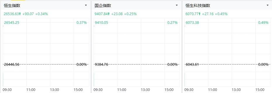 9月16日(周二)三大指数高开,香港恒生指数开盘上涨90.07点,涨幅0.34%,报26536.63点;香港恒生科技指数开盘上涨27.16点,涨幅0.45%,报6070.77点;国企指数开盘上涨23.08点,涨幅0.25%,报9407.84点。
