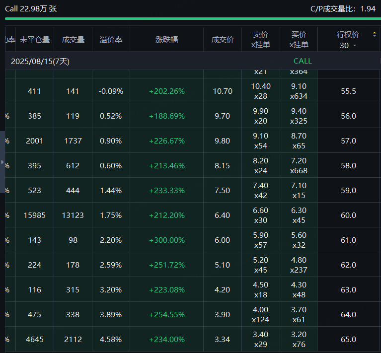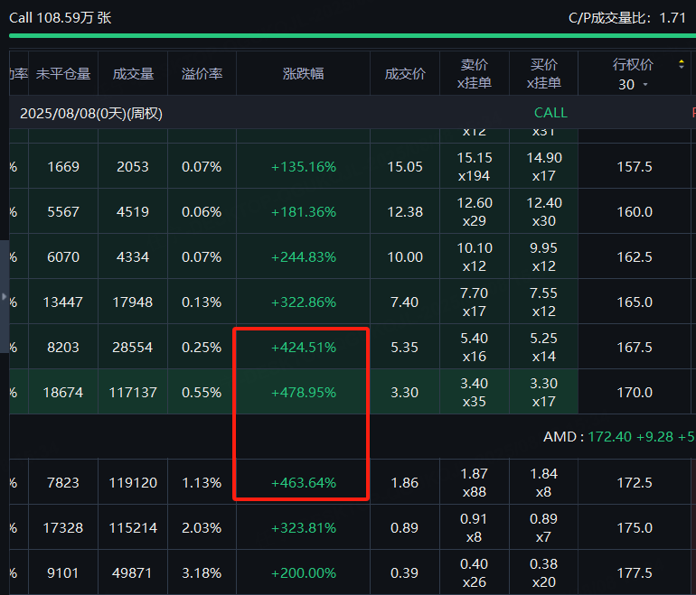 AMD昨日CALL单的成交价格大涨,多张合约涨幅超400%。