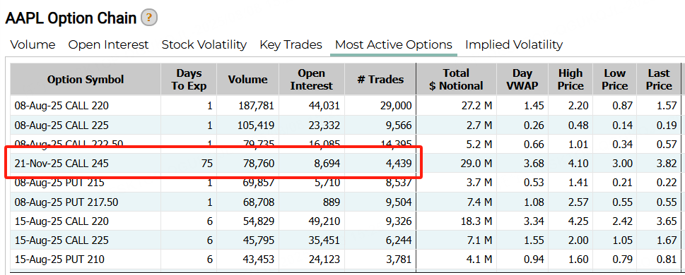 期权方面, 苹果 昨日排名前列的活跃成交均为认购合约。其中一份11月到期的CALL,行权价245美元,在2月末的低开缺口位置,较现价有10%以上的涨幅空间。