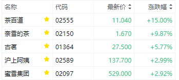 茶饮股走高,茶百道涨超15%,奈雪的茶涨近10%,古茗涨超5%,沪上阿姨、蜜雪集团涨近3%。