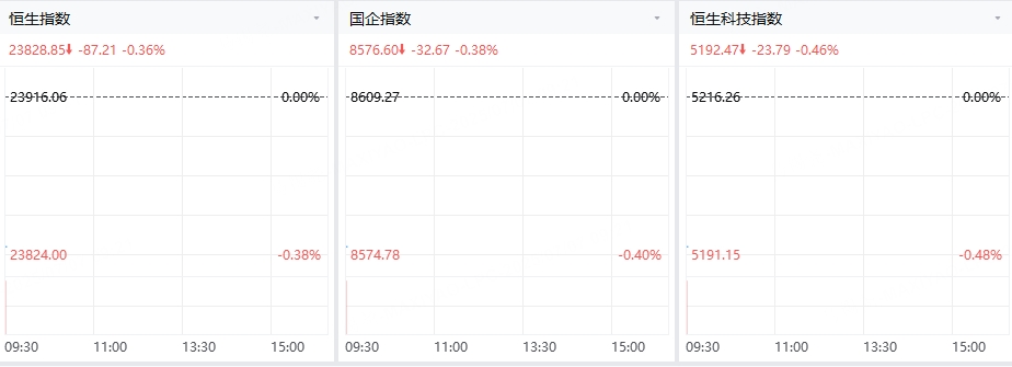 周一(7月7日)三大指数小幅低开,香港恒生指数开盘下跌87.21点,跌幅0.36%,报23828.85点;香港恒生科技指数开盘下跌23.79点,跌幅0.46%,报5192.47点;国企指数7月7日(周一开盘下跌32.67点,跌幅0.38%,报8576.6点。