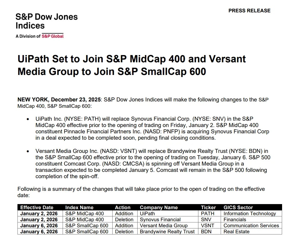 标普道琼斯指数官网发布公告:UiPath将取代西诺乌斯金融成为标普中盘股400指数成分股,调整于2026年1月2日开盘前生效;VERSANT MEDIA GROUP INC将取代 布兰迪维因不动产信托成为标普小型股600指数成分股,调整于2026年1月6日开盘前生效。