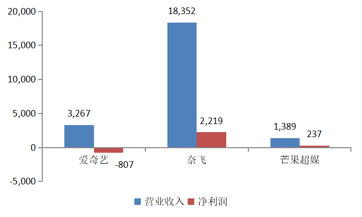 图3:2020年前三季度爱奇艺、奈飞、芒果超媒营收和利润对比(单位:百万美元),资料来源:wind